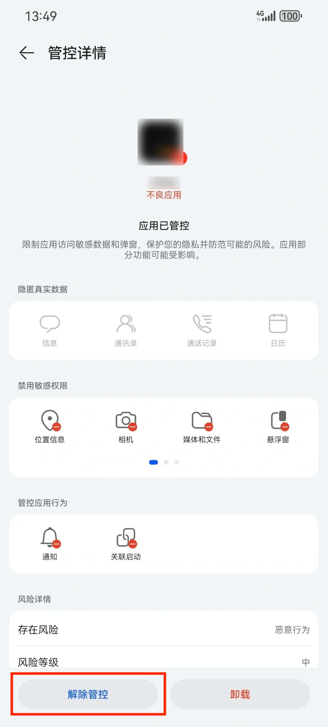 2.点击被管控的应用,点击左下角的“解除管控”